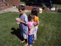 *Water Tag: Fill a large bucket with water and supply every child with a plastic cup. Place the bucket full of water in the middle of your yard, and have them fill their cups. Now have them stand with their backs facing the bucket and each other. When you give the command have them take five steps forward and then say "Go". Make sure you get out of the way, unless you want to get wet too!