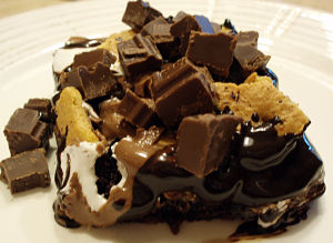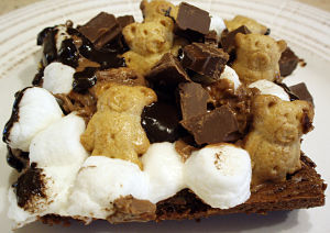 Step 3- Pick your toppings. You can use a marshmallow creme to spread on top of the brownies (shown in the top picture), or just use mini-marshmallows sprinkled around (shown in the bottom picture). We've used both with yummy results. Add broken graham crackers, or get a little more creative~ Honey Teddy Grahams work great for children. All that is required for smores brownies is a graham cracker of some form. Now~ time for chocolate. Take your pick~ you can use dark, milk, or white varieties. (It's all chocolate- how can you go wrong?!) Use broken chocolate bars or chocolate chips of any variety. If you want your chocolate melted, place on top of the brownies while the brownies are still warm, or place the whole brownie mixture in the oven for a few minutes to melt. If you used marshmallows, they will brown slightly if you put the tray back into the oven.
